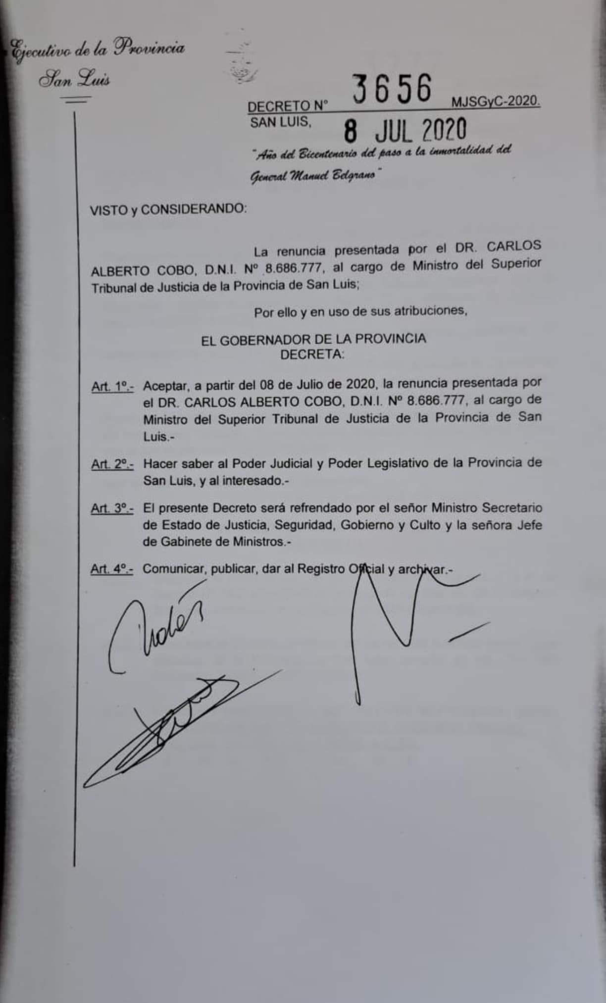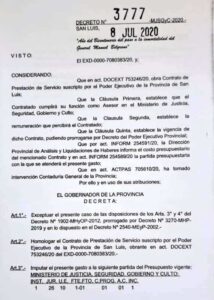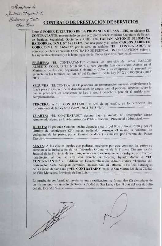 El eje de las acusaciones radica en los decretos firmados el 8 de julio de 2020, cuando Cobo presentó su renuncia como ministro del Superior Tribunal de Justicia. Según consta en los documentos, ese mismo día se oficializó un contrato de prestación de servicios por 24 meses, prorrogable, y con un sueldo que, según trascendió, alcanzaría cifras millonarias.
